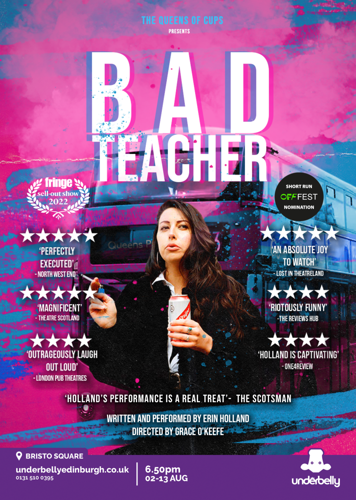 Written and performed by Erin Holland and directed by Grace O’Keefe, The Queens of Cups draw upon their years as 20-something teachers in Bad Teacher, a dark comedy about the trials and tribulations a 20-something female teacher faces in a London-based Sixth Form College. After two five-star sell-out EdFringe runs, the show concluded its 2 year journey at The Pleasance London. Erin and Grace have adapted the play into a sitcom.
